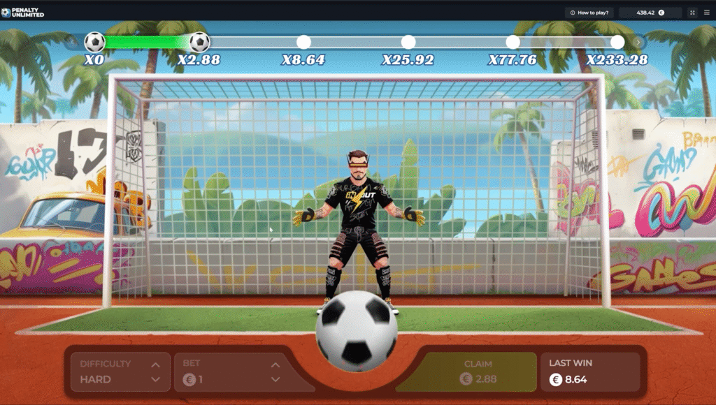 Dla osób ceniących elastyczność, gra oferuje trzy tryby umiejętności bramkarza: łatwy, średni i trudny. Po zmianie poziomu natychmiast aktualizują się wartości minimalnych i maksymalnych mnożników, co pozwala dopasować strategię do własnych preferencji. Poziom “trudny” daje szansę na naprawdę imponujące multiplikatory, choć wymaga jeszcze większej liczby udanych strzałów z rzędu, aby sięgnąć po najwyższą nagrodę.